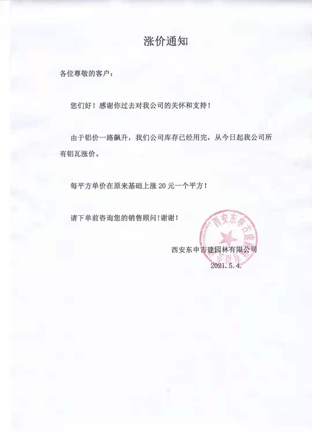 五月一以來作為古建筑瓦行業(yè)的東申瓦業(yè)的鋁合金仿古瓦片也在漲價,比之前的報價足足漲了20元,每個平方,希望很多老客戶給予理解,這個價格漲的是成本,也并非利潤,公司庫存已經(jīng)用完,5月之后的新單子,都需要從新從鋁廠拉原材料,直接按照新的價格執(zhí)行;希望新老客戶給予理解。