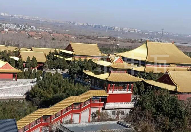 遠觀整體的效果更多的金光閃閃,富麗堂皇,顯得尤為高大尚,金色瓦使用于寺院更顯大氣蓬勃,比普通的灰色更氣質,現在狠多的仿古建筑屋面都使用金色瓦,加上led量化工程,打造特色旅游景區為標志建筑。