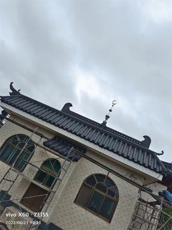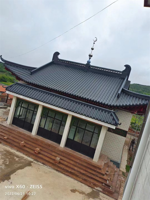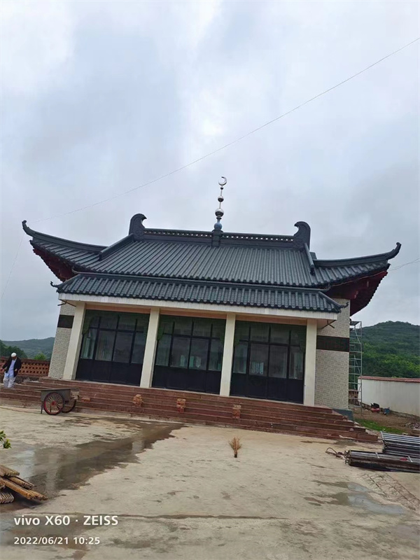甘肅張家川朝陽清真寺屋面金屬瓦工程采用3號分體瓦,厚度:1.2mm,面積約346個平方;顏色為灰色:風格:新中式仿古風。清真寺專用仿古瓦就選擇東申鋁瓦,適合西北寺院屋面,可達80年長久壽命。