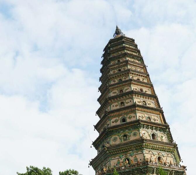 塔的形式為平面八角十三層樓閣式,通高47.31米,自下而上逐層收縮,塔檐幾乎可以連成一條直線,形如錐體。由于其塔身五彩斑斕如雨后彩虹,故名“飛虹塔”。飛虹塔是五座佛祖舍利塔和中國現(xiàn)存四座古塔之一,也是迄今為止發(fā)現(xiàn)的唯一留有工匠題款、最大最完整的琉璃塔。