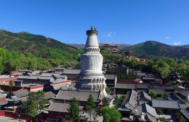 文殊發(fā)塔,又稱小白塔,位于方丈院東邊,與方丈院僅一墻之隔,喇嘛式磚塔,通高十米。據(jù)傳塔內(nèi)收藏有文殊菩薩顯圣時遺留的金發(fā),故名。文殊發(fā)塔始建于元大德五年(1301),明萬歷二十四年(1596)寺僧圓廣重建,后遭焚燒,其后又有重建。