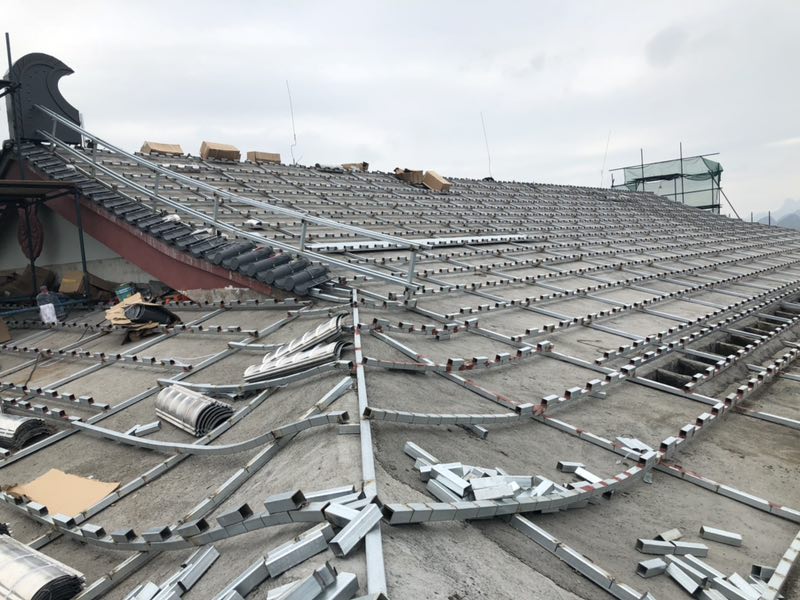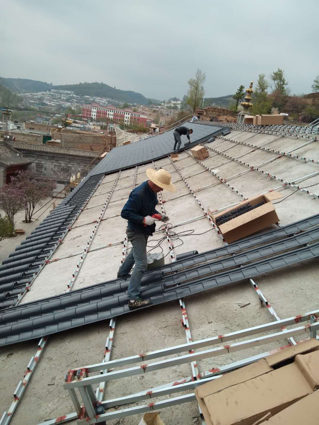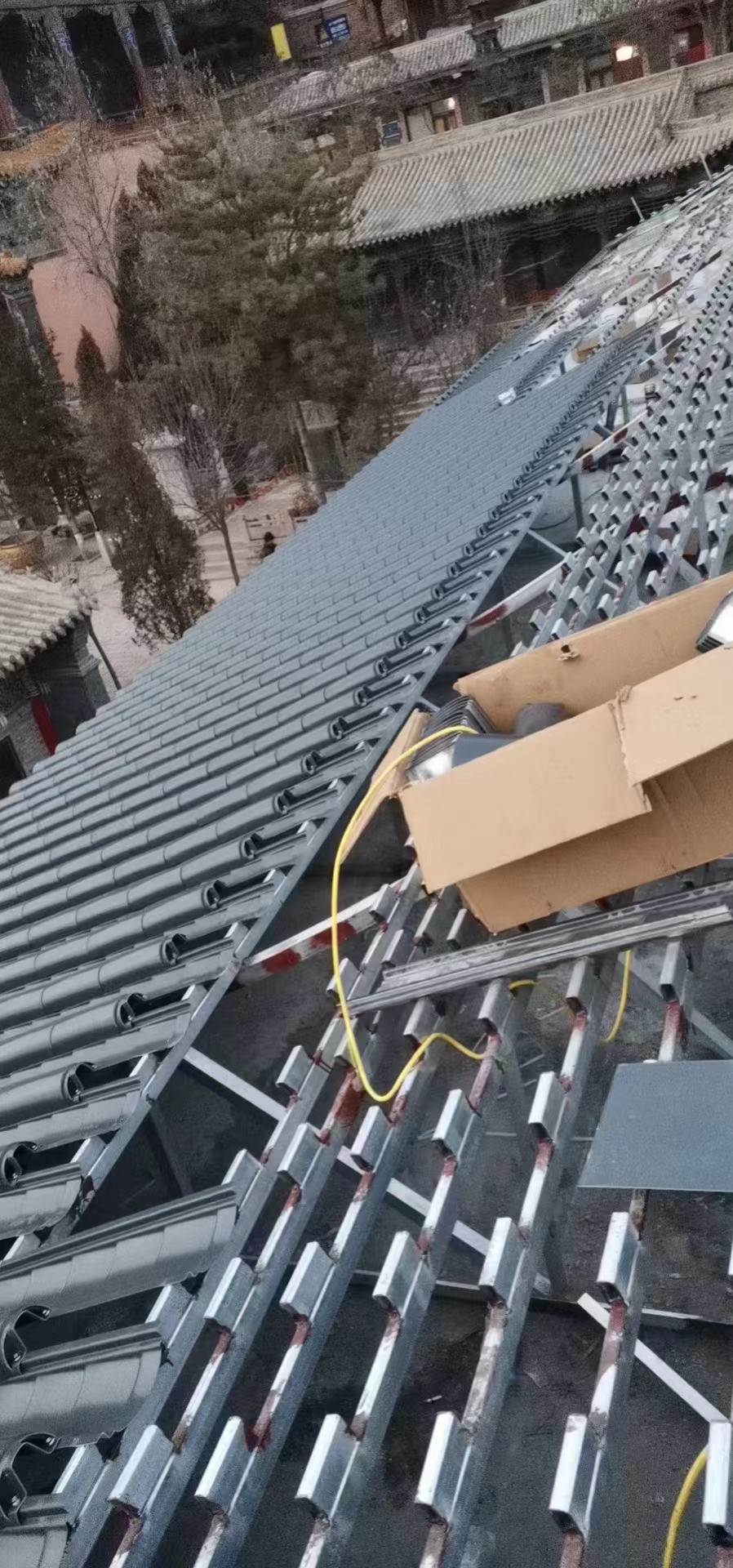 最后,焊接屋脊安裝屋脊瓦,包括正脊和垂脊,陰陽角屋面瓦的安裝。
