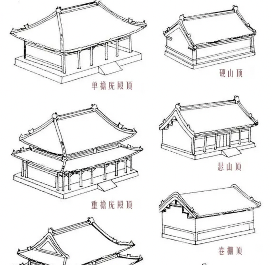 中國古修磚瓦傳統屋頂有以下七種,其中以重檐廡殿頂、重檐歇山頂為 級別最高,其次為單檐廡殿、單檐歇山頂。