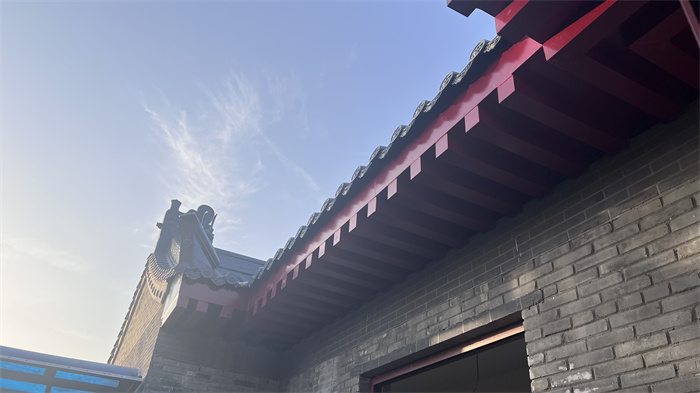 西安臥龍寺屋面鋁鎂錳合金瓦全面施工完畢,選用3號分體瓦,1.2mm厚,面積約780平方。整體風格:明清風格;屋檐下紅色方椽也選用鋁鎂錳合金材質;搭配明清風格金屬瓦;整體屋面效果,質感亮麗,清新脫俗,跟臥龍寺的氣質完全匹配。