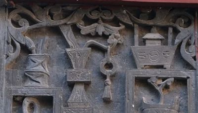 常見傳統(tǒng)磚雕戧檐圖案有,花卉、動(dòng)物、植物、博古等其它類別。如,月季花、牡丹花、荷花、菊花、海棠花、蘭花、吉祥草等。又如,仙鶴、喜鵲、獅子、麒麟、松鼠、魚、羊、鹿、鴛鴦、吉祥鳥等。再如,柿子、玉蘭、竹子、松柏、靈芝、仙桃、葡萄、花籃、枝藤蔓葉等。
