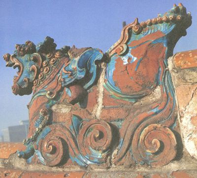 芮城永樂宮的玄帝廟正殿屋頂?shù)牧鹆е朴诩尉杆氖辏ü?/span>1563年);屋頂?shù)镍|吻豐滿盤曲,做工細(xì)致,小型盤龍纏繞整個(gè)鴟吻;脊身區(qū)域塑滿花卉,行龍貫穿其中,脊上左右都對稱設(shè)置有獅馱寶瓶;垂脊區(qū)域花卉和行龍布置密集,幾乎沒有留白縫隙,垂脊的下端垂獸尾巴翹起,作騰飛狀;此外,在屋脊正中位置設(shè)置單檐歇山頂門樓和勾欄,門樓明間凸起,鋪?zhàn)鳌⒅~都結(jié)構(gòu)構(gòu)件一應(yīng)俱全,精細(xì)寫實(shí);此類琉璃制品以紅膠泥為胎,上施黃綠色釉面。大殿兩側(cè)山花處的博風(fēng)板和封山壁都使用琉璃裝飾,其中博風(fēng)板采用醬黃色釉面琉璃,封山壁上面塑有二龍戲珠紋樣,下部塑有海浪和島嶼,上部塑流云和日月星辰,其技藝精湛讓人無不嘆服。
