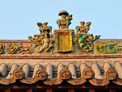 陽城湯王廟獻(xiàn)亭上的吻獸、脊飾、溝滴、排山、懸魚、博風(fēng)板等等都用琉璃作為裝飾件。根據(jù)屋頂吻獸背部題記可以知道其為明成化十七年本縣匠人所制;此類琉璃制品以白坩土為胎,施以黃、綠、藍(lán)、白、醬五色釉面;鴟吻上附著有一條小龍,昂首望天;鴟吻尾部類似于魚尾分叉,有遼代鴟吻的神韻;屋脊側(cè)的行龍姿態(tài)各異,垂脊下端塑有一條完整的行龍作垂獸,其面目猙獰,神態(tài)威武,而在四角處有嬪伽端莊的作為脊端,姿態(tài)威嚴(yán)雄壯。